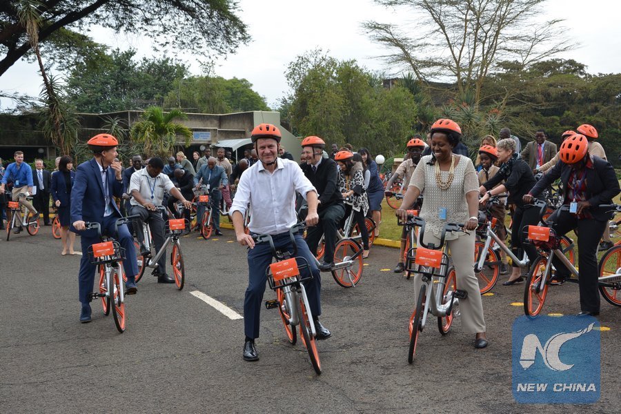 Executive Director of UN Environment (UNEP) Erik Solheim (C) and staff members ride on state-of-the-art bikes donated by China's Mobike at the United Nations Offices in Nairobi, Kenya on March 5, 2018. The United Nations Office at Nairobi on Monday launched a bicycle sharing transport scheme for staff and visitors as part of broader efforts to advance the green agenda. (Xinhua/Jin Zheng)