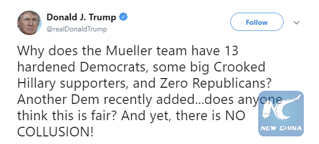 "Why does the Mueller team have 13 hardened Democrats, some big Crooked Hillary supporters, and Zero Republicans?" Trump tweeted Sunday.