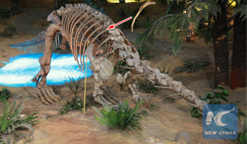 When the dinosaur was excavated in 1997, there was a pathological abnormality on one of its right ribs. A small hole penetrates almost halfway through the rib, said the museum's Wang Yi.