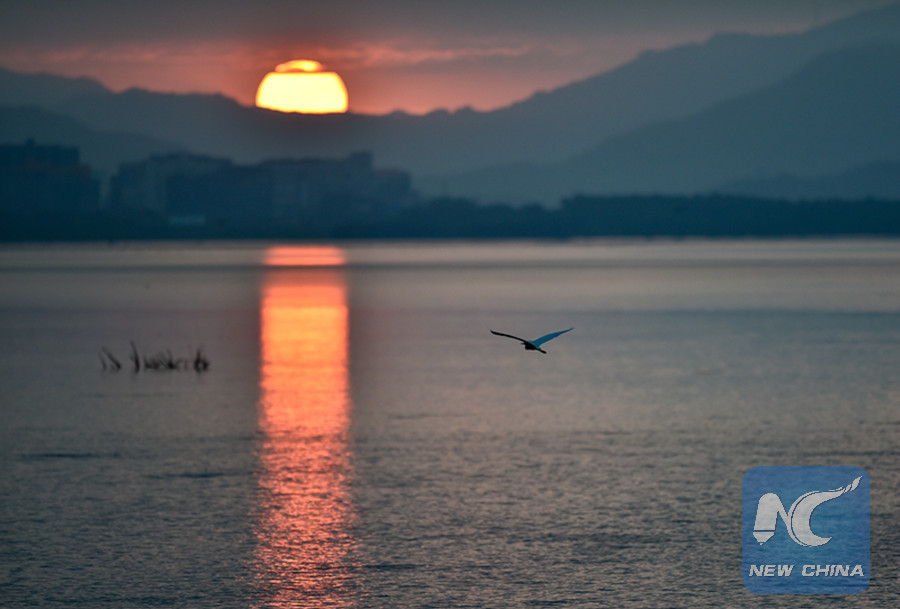 A migratory bird flies over Shenzhen Bay, south China's Guangdong Province, Nov. 9, 2017. (Xinhua photo/Mao Siqian)