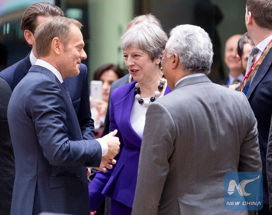 European Council President Donald Tusk (L, Front) talks with British Prime Minister Theresa May (C) and Portuguese Prime Minister Antonio Costa (R, Front) during the European Union (EU)'s spring summit at the EU headquarters in Brussels, Belgium, March 22, 2018. (Xinhua/Thierry Monass)