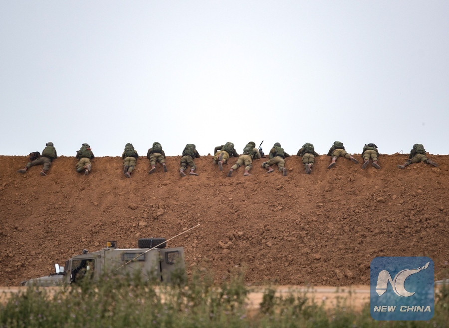 Israeli soldiers take position along the barrier between Gaza Strip and Israel in Nahal Oz, on March 30, 2018. (Xinhua/JINI)
