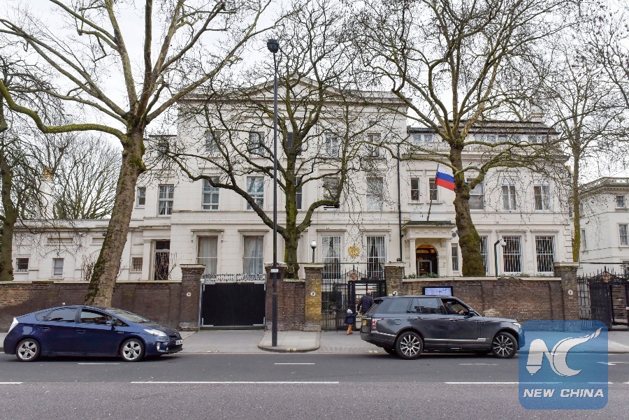 Photo taken on March 14, 2018 shows a general view of the exterior of the Russian Embassy in London, Britain. (Xinhua/Stephen Chung)