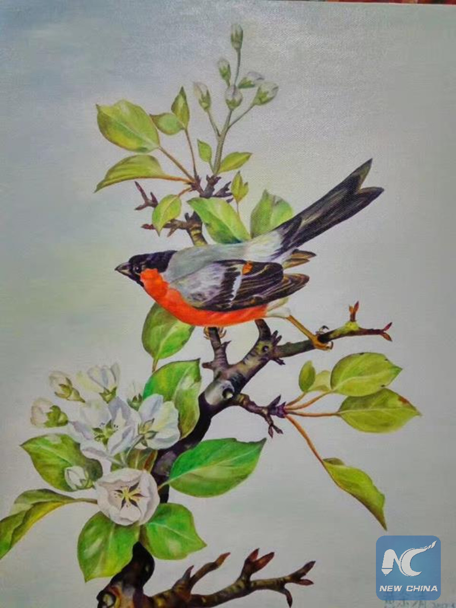 A painting drawn by Huang Yuqing, Chen's neighbor, in late 2017 shows a bird resting on a pear tree. (Xinhua)