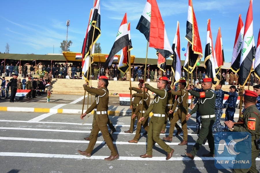 Iraqi soldiers take part in a parade in Mosul, Iraq on Dec. 14, 2017. Ninevah Operation Command of the Iraqi military on Thursday paraded in Mosul to celebrate the full liberation of Iraqi lands of the Islamic State (IS) group. (Xinhua/Khalil Dawood)