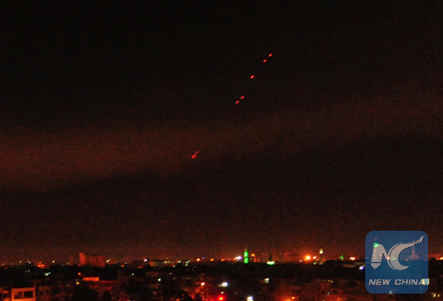 Surface-to-air missiles are seen in the night sky over the Syrian capital Damascus before daybreak on April 14, 2018, as the Syrian air defenses were responding to the U.S.-led airstrikes on Syria. (Xinhua/Ammar Safarjalani)