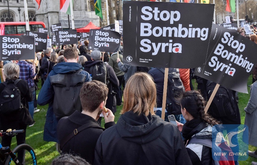 Anti-war demonstrators protest against a coalition missile strike in Syria launched by the U.S., France and Britain, at the Parliament Square in London, Britain, on April 16, 2018. (Xinhua/Stephen Chung)