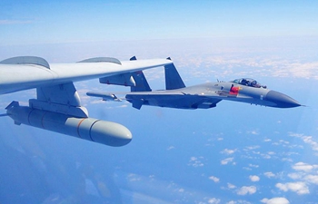 A Chinese People's Liberation Army (PLA) air force formation conducts island patrols during training on April 26, 2018. The formation was made up of fighters, early warning and surveillance aircraft, and H-6K bombers, which took off from various military airfields. The formation flew over the Miyako Strait and Bashi Channel, completing an island patrol, the subject of the training. (Xinhua/Zhai Peisong)