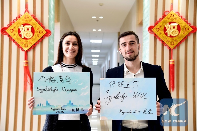 Russian student Zakir (R) and his sister Zaira, both studying in China University of Petroleum, display boards with Chinese and Russian handwritings of "Hello Qingdao" and "Hello SCO", in Qingdao, the host city of the Shanghai Cooperation Organization (SCO) Summit, in east China's Shandong Province, May 3, 2018. (Xinhua/Guo Xulei)