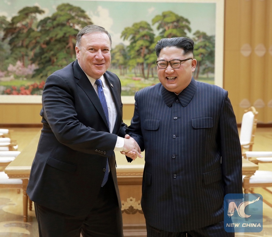 Photo provided by the Korean Central News Agency (KCNA) on May 10, 2018 shows Kim Jong Un (R), top leader of the Democratic People's Republic of Korea (DPRK), shaking hands with visiting U.S. Secretary of State Mike Pompeo on May 9, 2018. Kim Jong Un expressed confidence that his upcoming summit meeting with U.S. President Donald Trump would be a historic one. (Xinhua/KCNA)