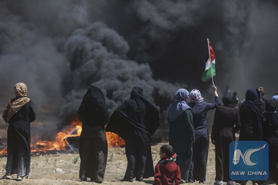 Palestinians clash with Israeli troops near the Gaza-Israel border, east of Gaza City, on May 14, 2018. (Xinhua/Wissam Nassar)