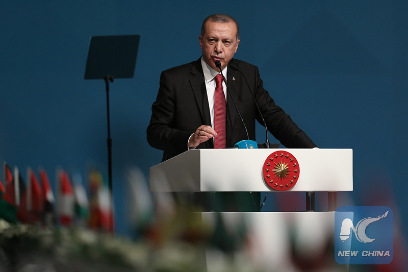 Turkish President Recep Tayyip Erdogan makes a speech at an extraordinary summit of the Organization of Islamic Cooperation (OIC) in Istanbul, Turkey, on May 18, 2018. (Xinhua/Anadolu Agency)