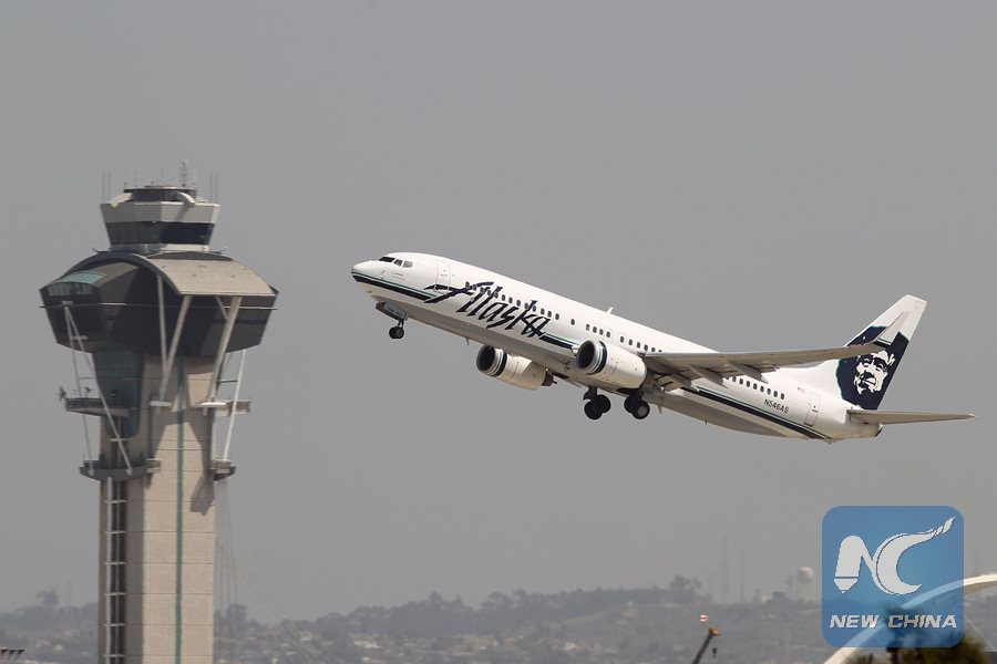 An Alaska Airlines jet passes the air traffic control tower at Los Angles International Airport (LAX) during take-off on April 22, 2013 in Los Angeles, California.(Xinhua/AFP PHOTO)