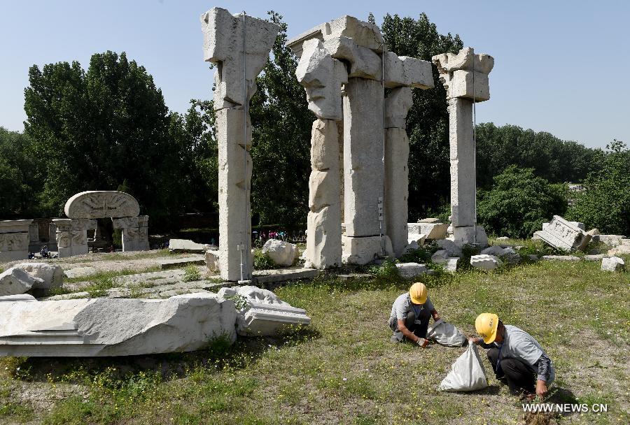 Staff members clean up weeds at ruins of Yuanying Guan (Immense Ocean Observatory) at Yuanmingyuan in Beijing, capital of China, May 23, 2018. The four-month reinforcement project of ruins of Immense Ocean Observatory at the historical site of Yuanmingyuan started lately.(Xinhua/Luo Xiaoguang)