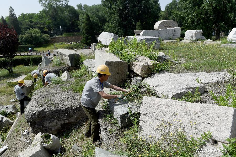 Staff members clean up weeds at ruins of Yuanying Guan (Immense Ocean Observatory) at Yuanmingyuan in Beijing, capital of China, May 23, 2018. The four-month reinforcement project of ruins of Immense Ocean Observatory at the historical site of Yuanmingyuan started lately.(Xinhua/Luo Xiaoguang)
