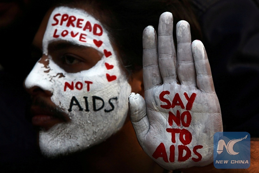 A student displays his face and hand painted with messages during an HIV/AIDS awareness campaign on the occasion of World AIDS Day in Chandigarh, India, Dec. 1, 2017. (Xinhua/REUTERS)