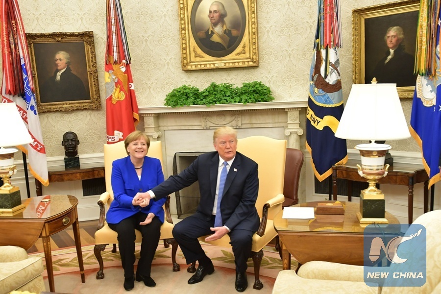 In this file photo taken on April 27, 2018, U.S. President Donald Trump meets with German Chancellor Angela Merkel in the Oval Office of the White House in Washington, D.C. (Xinhua/AFP)