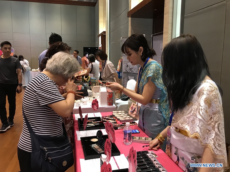 Visitors look at Thai products at the Thai Festival 2018 “Spice up Your Day with Thai Tastes”. The festival was held at the Royal Thai Embassy, Beijing, June 23, 2018. This is the second time that the Thai Festival is organised here as guests can enjoy various activities in the midst of Thai surroundings. (Xinhuanet/Liang Yurou)