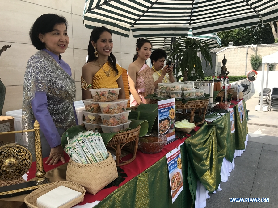 Staff present Thai food from the Royal Thai Embassy Beijing at the Thai Festival 2018 “Spice up Your Day with Thai Tastes”. The festival was held at the Royal Thai Embassy, Beijing, June 23, 2018. This is the second time that the Thai Festival is organised here as guests can enjoy various activities in the midst of Thai surroundings. (Xinhuanet/Liang Yurou)