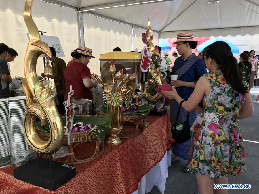 Visitors enjoy Thai food at the Thai Festival 2018 “Spice up Your Day with Thai Tastes”. The festival was held at the Royal Thai Embassy, Beijing, June 23, 2018. This is the second time that the Thai Festival is organised here as guests can enjoy various activities in the midst of Thai surroundings. (Xinhuanet/Liang Yurou)