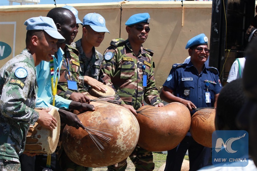 United Nations (UN) peacekeepers take part in a traditional dance during the 71st anniversary celebrations of the UN in Juba, South Sudan, Oct. 24, 2016. (Xinhua/Gale Julius)