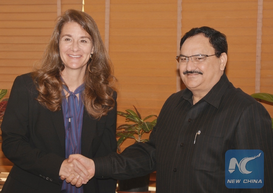 Melinda Gates (L), wife of Microsoft founder and billionaire philanthropist Bill Gates, shakes hands with Indian Union Minister for Health and Family Welfare Jagat Prakash Nadda in New Delhi, India, April 20, 2015. (Xinhua Photo)