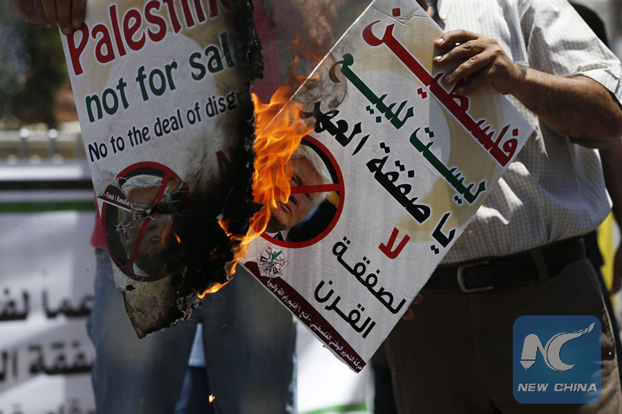 Palestinians burn portraits of U.S. President Donald Trump during a demonstration in the West Bank city of Ramallah against U.S. policy supporting Israel on July 2, 2018. (AFP photo)