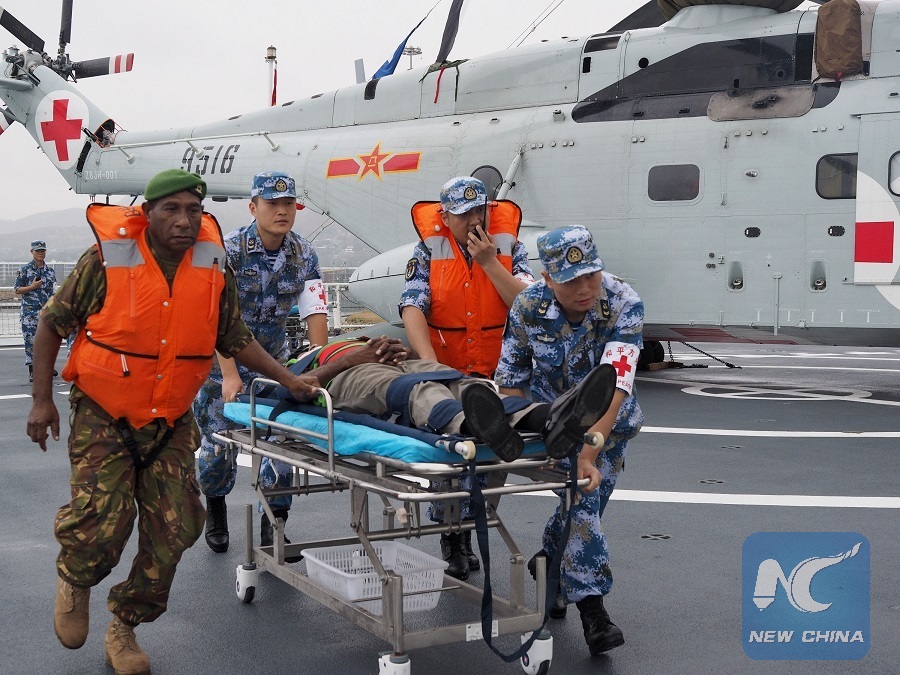 The scenario on Tuesday morning was part of a joint emergency rescue drill between the medical staff of Chinese naval hospital ship Ark Peace and their military and civilian counterparts of Papua New Guinea, in the Oceanian country's capital Port Moresby.