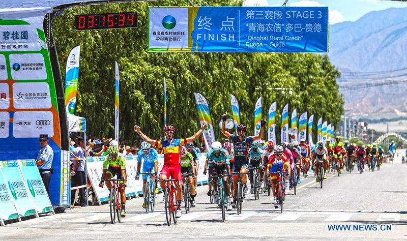 Eduard Michael Grosu from Italian Nippo-Vini Fantini Team (NIP) wins the third stage of the Tour of Qinghai Lake in northwest China's Qinghai Province, on July 24, 2018. (Xinhuanet Photo by Jia Haiyuan)