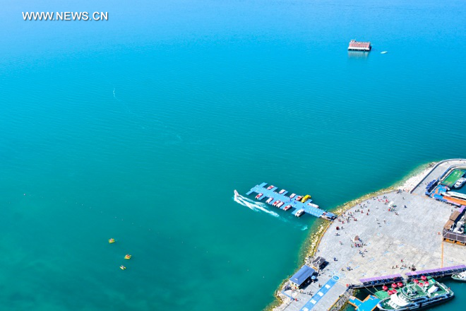 A glimpse of Qinghai Lake, on June 27, 2018. (Xinhuanet Photo by Pan Binbin)