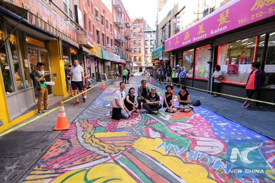 People look at the newly painted ground mural in Doyers Street in Manhattan's Chinatown, New York City, July 20, 2018. Doyers Street, a 200-foot-long street in the heart of Chinatown, is being covered with a vibrant mural by artist Chen Dongfan titled "The Song of Dragons and Flowers." (Xinhua/Wang Ying)