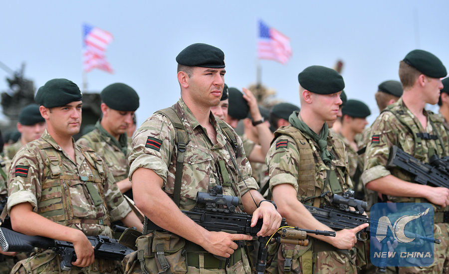 Soldiers take part in the multinational military drill named "Noble Partner 2018" at Vaziani base near Tbilisi, Georgia, Aug. 1, 2018. (Xinhua/Kulumbegashvili Tamuna)
