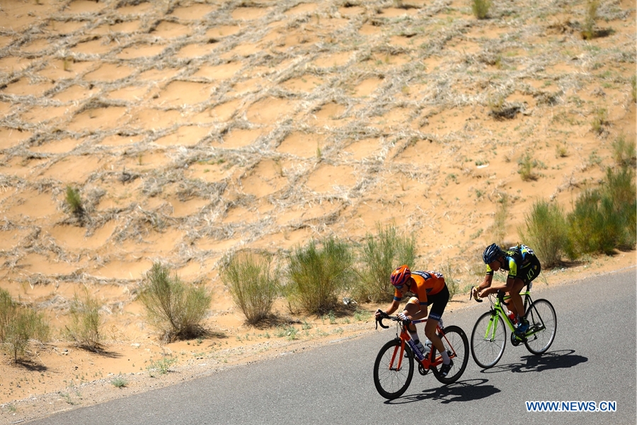 Cyclists compete in the Tenggeli desert in the tenth stage of the Tour of Qinghai Lake in northwest China's Gansu Province, on August 1, 2018. (Xinhuanet Photo by Jia Haiyuan)