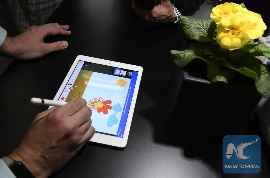 A customer experiences a new iPad in Chicago, the United States, on March 27, 2018. Apple on Tuesday introduced a new iPad with a digital pencil to draw and write plus greater performance in Chicago. (Xinhua Photo)