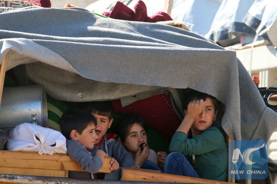 Syrian children ride a truck carrying their personal belongings at a Lebanese army checkpoint in Wadi Hmeid in the Bekaa valley, after leaving the village of Arsal to return to their homes inSyria's Qalamoun region on July 23, 2018. (Xinhua/AFP PHOTO)