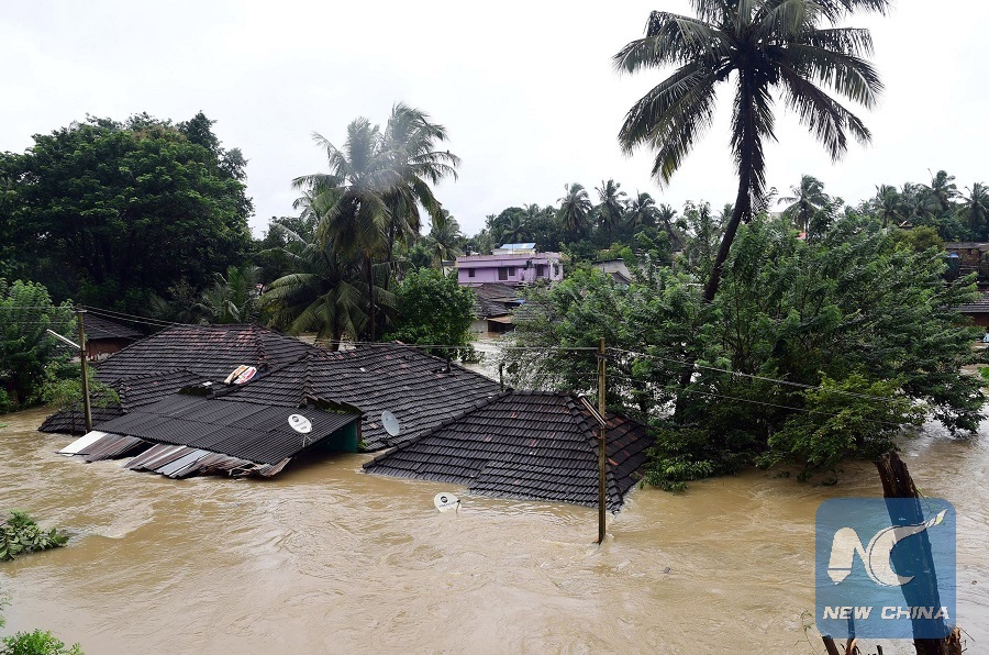 Photo taken on Aug, 9, 2018 shows submerged houses due to heavy rains in Idukki, the southernIndian state of Kerala. (Xinhua/Stringer)