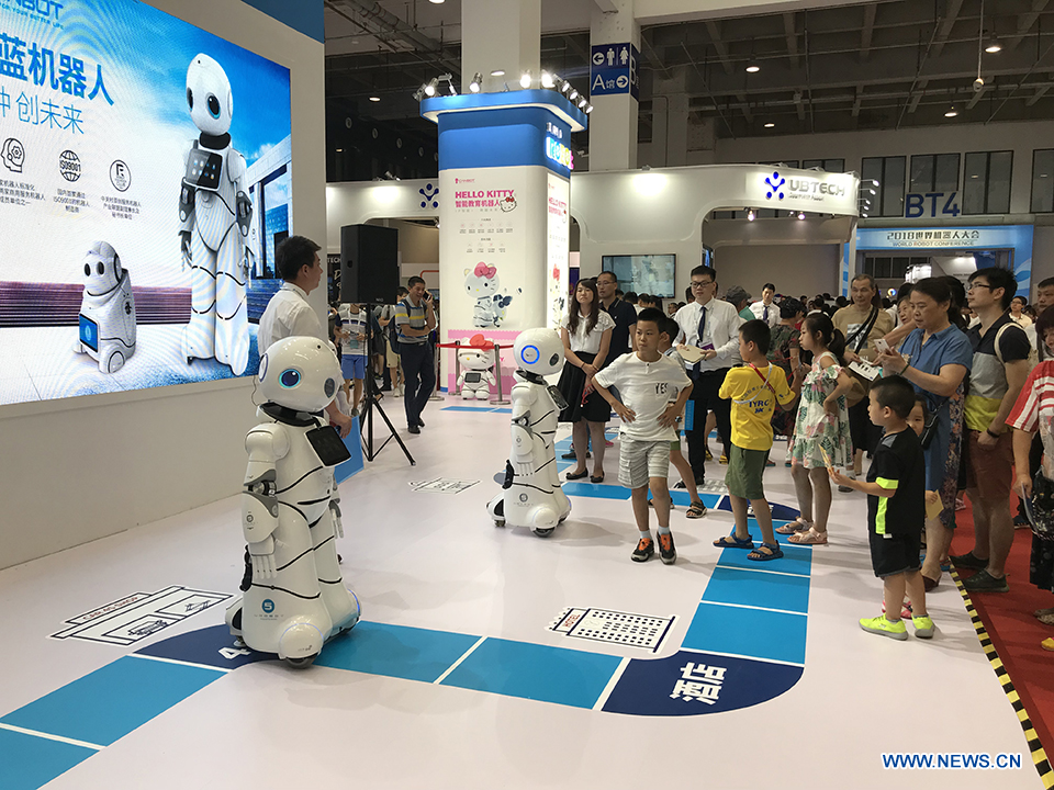 Visitors watch robots performing at the 2018 World Robot Conference in Beijing, Aug. 17, 2018. The conference attracts a total of 166 domestic and international enterprises exhibiting their cutting edge technologies and more than 500 items are displayed at the scene. (Xinhuanet/Liang Yurou)