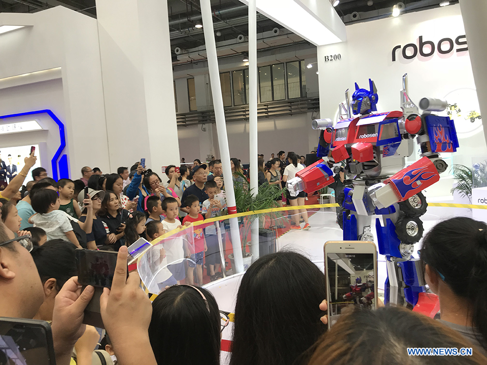 Visitors watch a robot performing at the 2018 World Robot Conference in Beijing, Aug. 17, 2018. The conference attracts a total of 166 domestic and international enterprises exhibiting their cutting edge technologies and more than 500 items are displayed at the scene. (Xinhuanet/Liang Yurou)