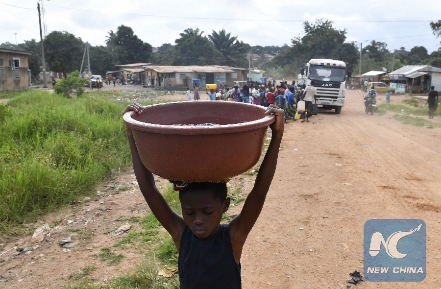 File Photo: A child carries a bucket of water after a worker of the National Office of Drinking Water (ONEP) distributed water to the population on June 2, 2018 in a district of Bouake, central Cote d'Ivoire. (Xinhua/AFP)