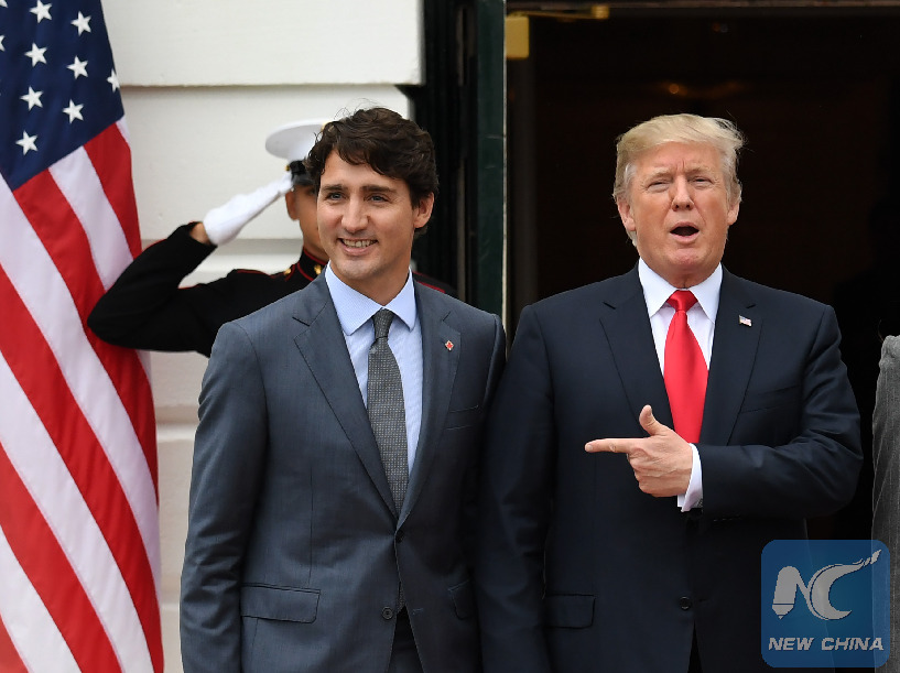 FILE PHOTO: U.S. President Donald Trump (R) welcomes visiting Canadian Prime Minister Justin Trudeau at the White House in Washington D.C., the United States, on Oct. 11, 2017. Trump met with Trudeau Wednesday amid new NAFTA negotiations. (Xinhua/Yin Bogu)