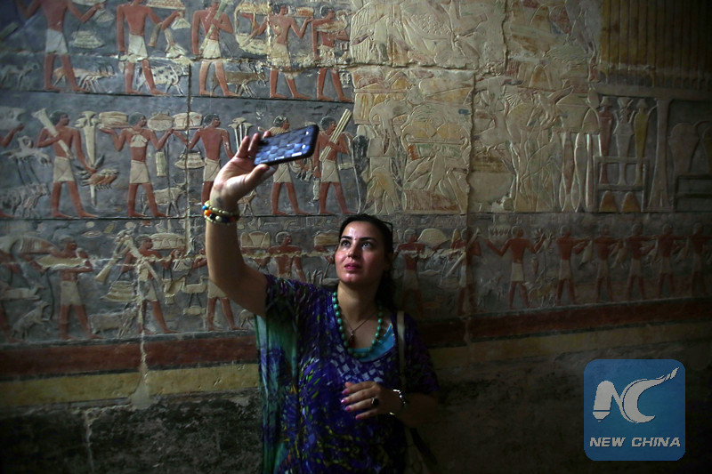 A woman takes selfies inside a tomb in Giza, Egypt, on Sept. 8, 2018. Egypt inaugurated Saturday an Old Kingdom tomb of a man called Mehu who was a minister during the end of the Sixth Dynasty. (Xinhua/Ahmed Gomaa)