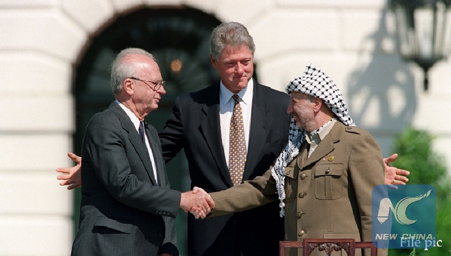 File photo: The picture taken on September 13, 1993 shows US President Bill Clinton (C) stands between PLO leader Yasser Arafat (R) and Israeli Prime Minister Yitzahk Rabin (L) as they shake hands for the first time, at the White House in Washington DC, after signing the historic Israel-PLO Oslo Accords on Palestinian autonomy in the occupied territories. (AFP photo)
