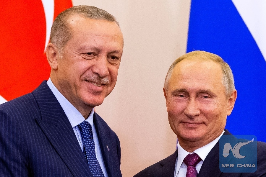 Russian President Vladimir Putin (R) shakes hands with Turkish President Recep Tayyip Erdogan after their joint press conference following the talks, in the Bocharov Ruchei residence in the Black Sea resort of Sochi on Sept. 17, 2018. (Xinhua/AFP)