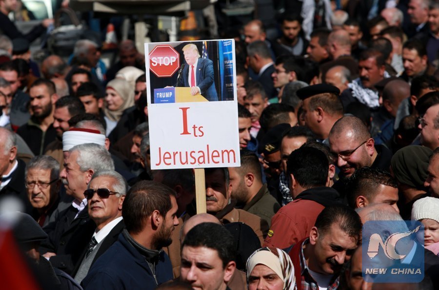 File Photo: A Palestinian holds a placard against U.S. President-elect Donald Trump during a protest in the West Bank city of Nablus, on Jan. 19, 2017. Thousands of Palestinians demonstrated in the West Bank against the U.S. President-elect Donald Trump's intention to move the American embassy from Tel Aviv to Jerusalem. (Xinhua/Ayman Nobani)