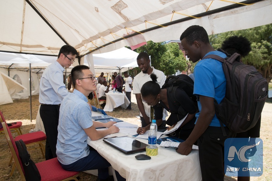 Representatives of Chinese enterprises talk with job seekers during a jobs expo at the University of Zambia in Lusaka, Zambia, Oct. 26, 2018. (Xinhua/Peng Lijun)