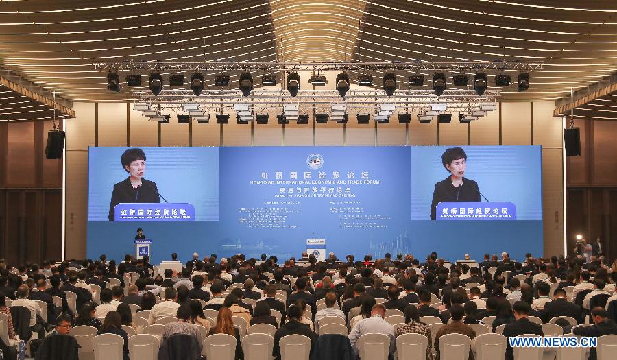 Gao Yan, head of the China Council for the Promotion of International Trade (CCPIT), presides over the Parallel Session on Trade and Opening of the Hongqiao International Economic and Trade Forum in Shanghai, east China, Nov. 5, 2018. (Xinhua/Yin Gang)