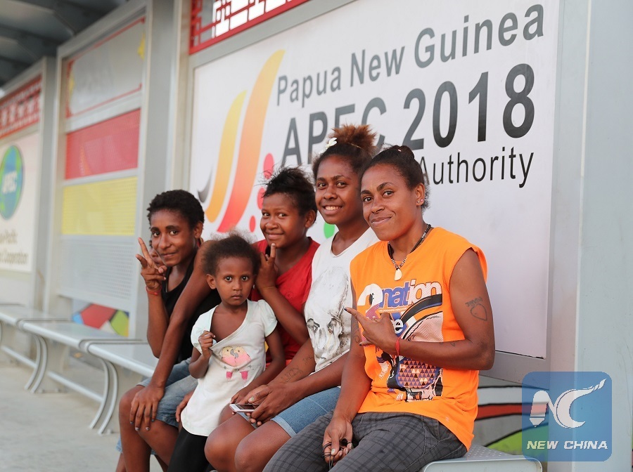 People pose for photo while waiting for bus in Port Moresby, Papua New Guinea, on Nov. 11, 2018. (Xinhua/Bai Xuefei)