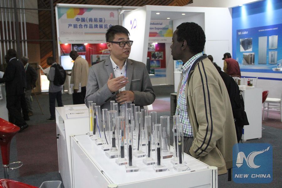 A Chinese businessman is showcasing his products during the China-Kenya Industrial Capacity Cooperation Exposition in Nairobi, capital of Kenya, Nov. 15, 2018. (Xinhua/Allan Mutiso)