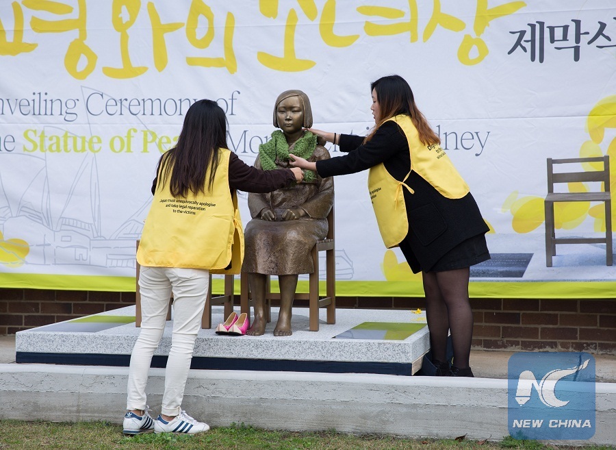 File Photo: Staffs wear a scarf for the statue during the unveiling of a "comfort women" statue in Sydney, Australia on Aug. 6, 2016. (Xinhua/Zhu Hongye)