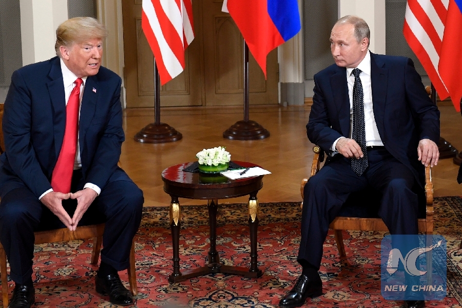 File Photo: U.S. President Donald Trump (L) meets with his Russian counterpart Vladimir Putin in Helsinki, Finland, on July 16, 2018. (Xinhua/Lehtikuva/Heikki Saukkomaa)